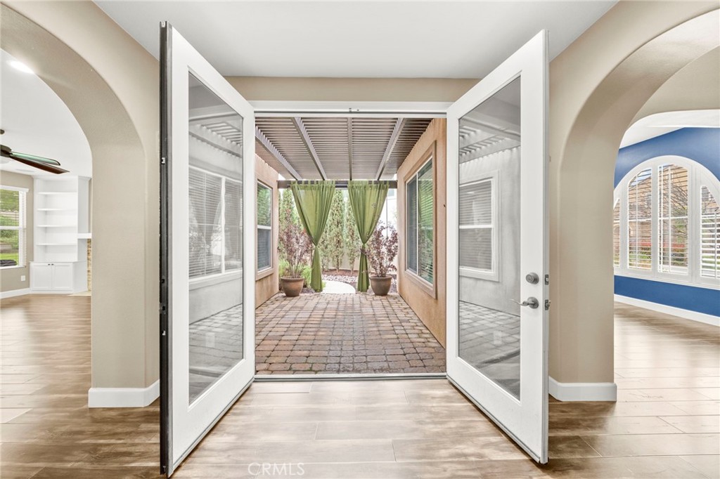 Step into a lifestyle of luxury, comfort, and smart living in this stunning 4-bedroom, 3.5-bathroom pool home located in the prestigious Wolf Creek community of South Temecula. Positioned on an impressive 14,810 SqFt lot at the end of a cul-de-sac, this 3,071 SqFt residence is packed with custom upgrades and high-end finishes that elevate everyday living. From the moment you arrive, you're welcomed by a charming front porch, decorative tile accents, and elegant arched architectural details that flow throughout the home. Inside, a versatile front room with custom-built-in shelving and pocket doors offers flexible use as a home office, library, or lounge. The formal dining room showcases a rich wood accent wall and French doors leading to a cozy side patio, perfect for morning coffee or evening relaxation. A remodeled powder room with custom marbled counters adds a fresh and stylish touch, while the open-concept kitchen and family room are perfect for gathering. Enjoy granite countertops, an island, stainless-steel appliances, a coffee or wine nook, and a tiled fireplace flanked by custom-built-ins. Guests will love the main floor bedroom suite with a private full bath and walk-in closet. Upstairs, a loft and built-in desk area provide creative and functional space for crafts, studying, or working from home. Two additional bedrooms share a beautifully updated Jack and Jill bathroom with dual sinks and a tiled shower-tub combo. The second-floor laundry room with custom wallpaper adds convenience. The primary suite is a true retreat, featuring an accent wall, pendant lighting, and roller shades. The ensuite bath is designed for indulgence with dual vanities, a soaking tub, and a massive steam shower with dual shower heads and a heated bench. The bathroom floors are also heated for added comfort, and the walk-in closet includes built-in organizers. The backyard is a personal oasis with a sparkling pool, built-in fire pit, covered patio, lawn, and garden space. Additional highlights include solar, a heat pump, smart light switches, a whole-house water filter, and a water descaler. The tandem garage offers bonus storage with built-in cabinets and is finished with epoxy flooring. Enjoy proximity to top-rated schools, Pechanga Resort, wine country, and the best of South Temecula's parks, shopping, and dining.